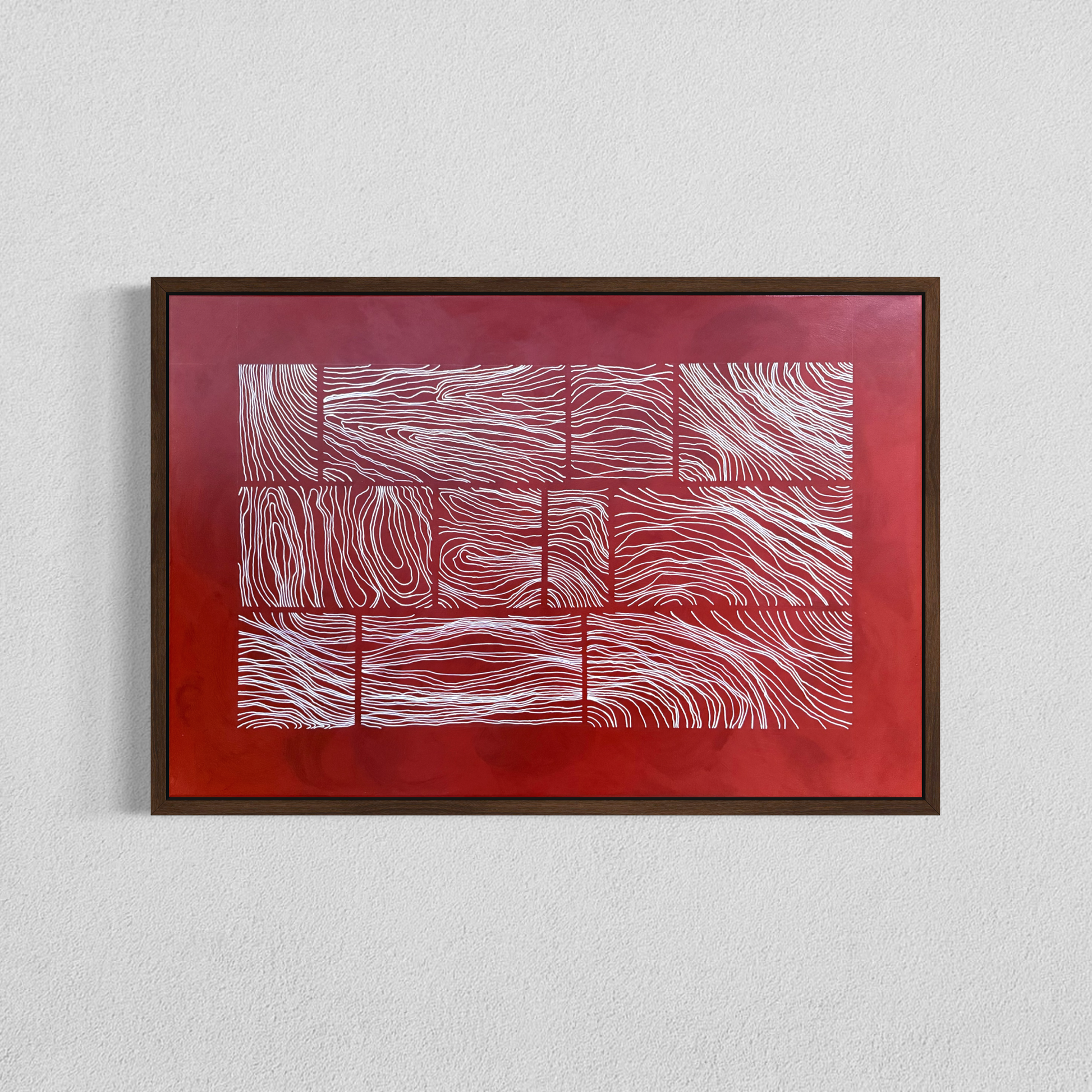 Color is restrained and weight-bearing. The burnt sienna ground establishes pressure and depth, while the white lines register as measured traces—held, not expressive. The surface reads as a sustained condition of balance, where tension is distributed evenly across the composition.