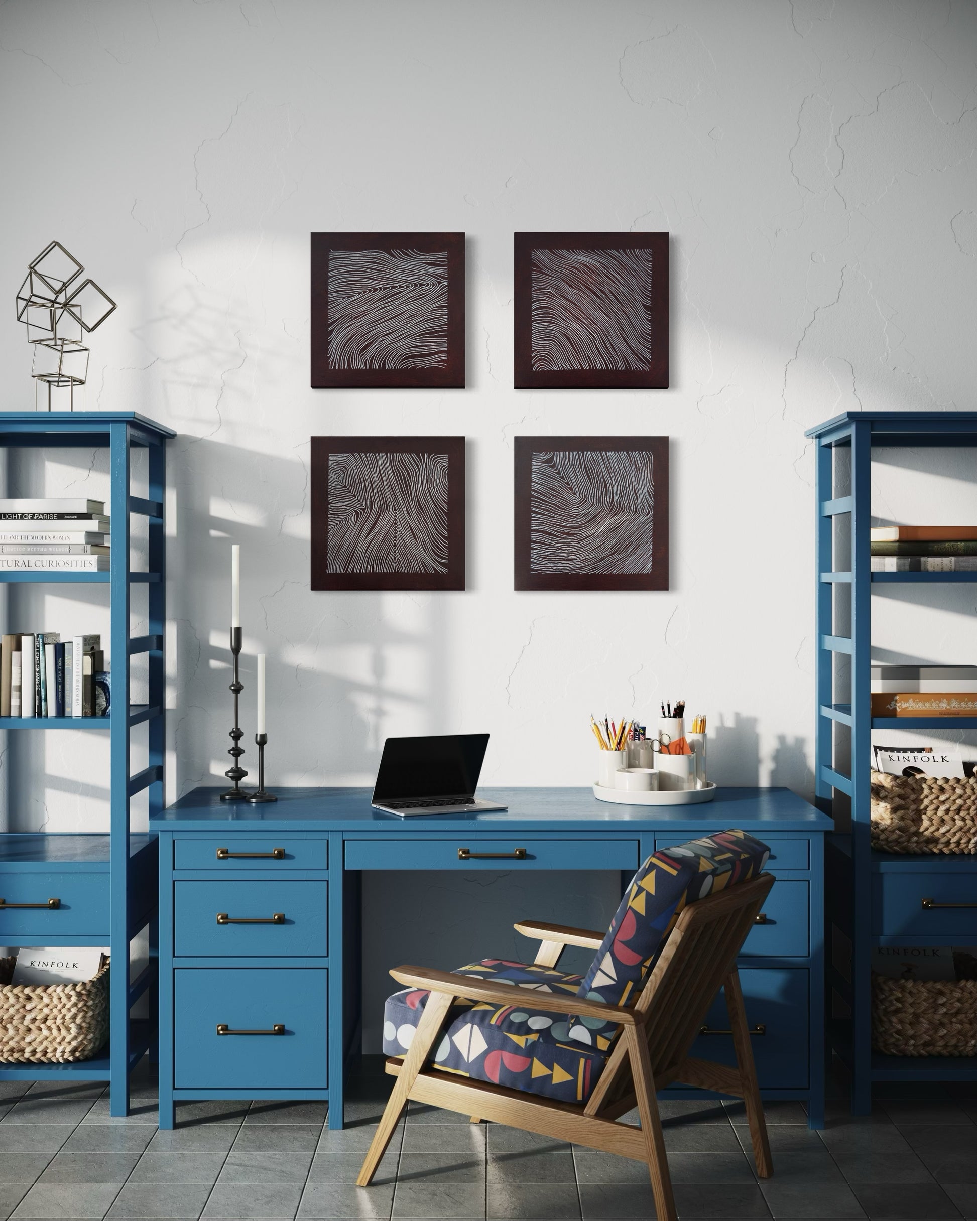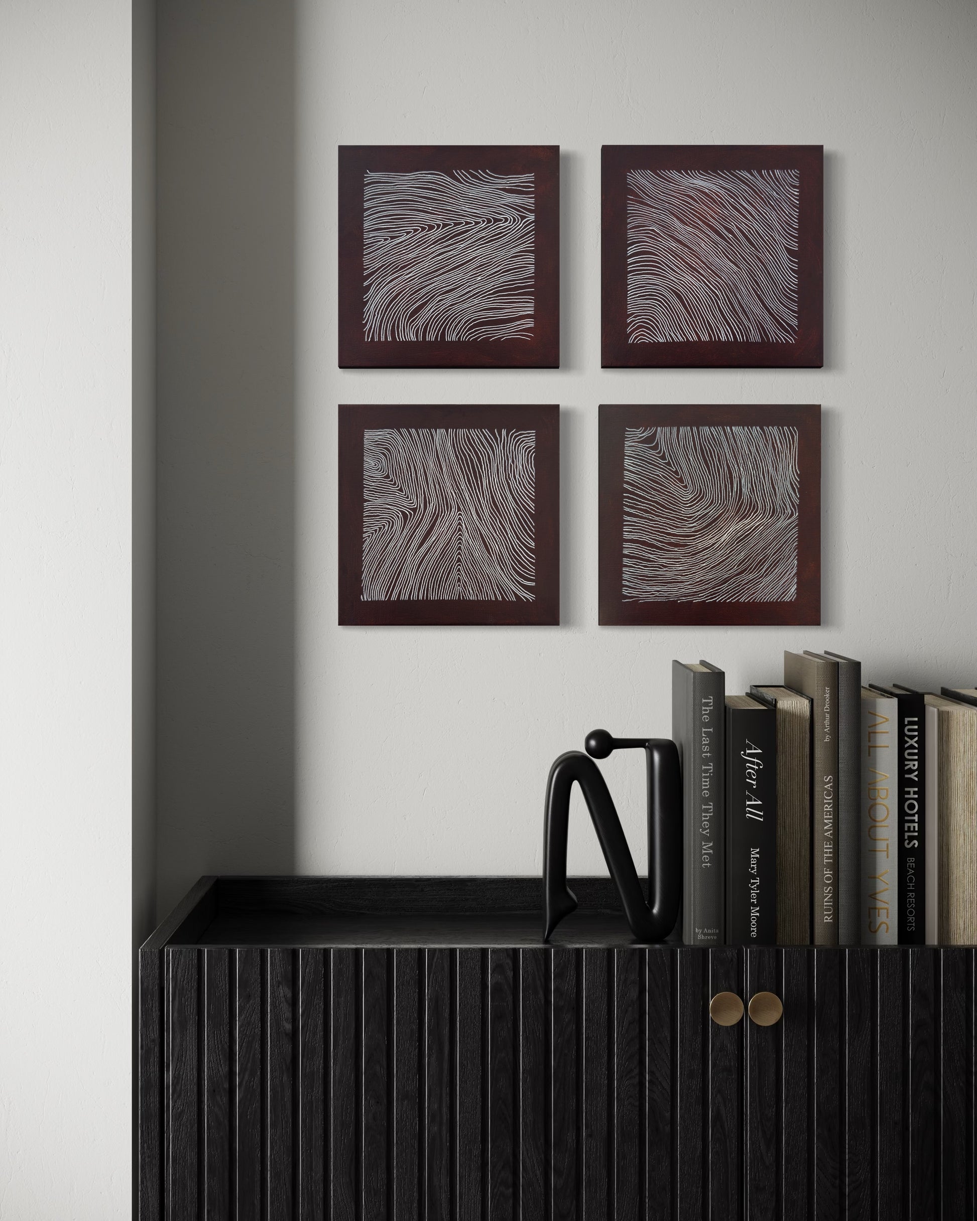 While the compositions differ in directional flow and density, they share a common logic of restraint. Variation occurs internally rather than expansively. The separation between panels emphasizes discontinuity without fragmentation.