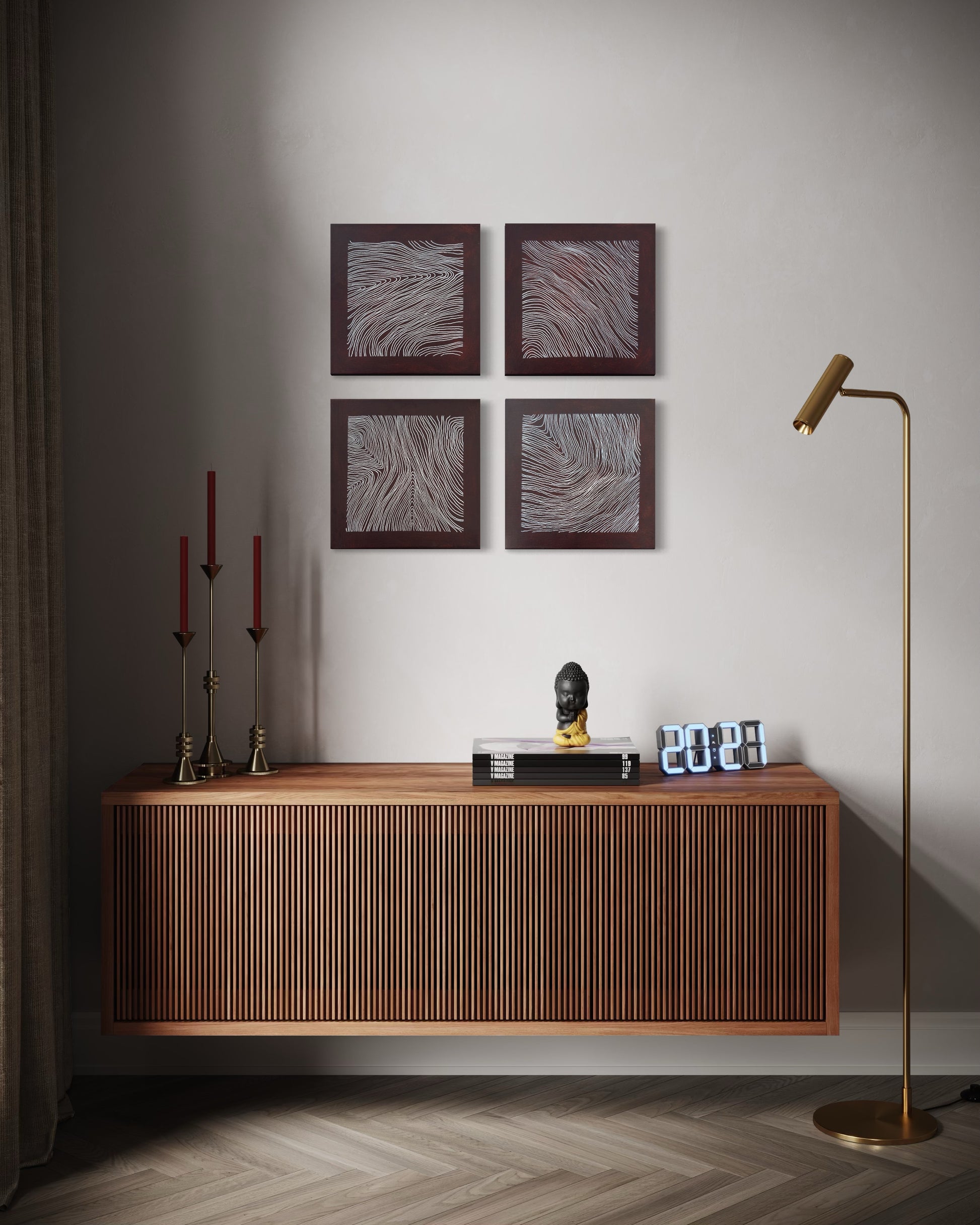 Parts investigates division as a structural principle. The four panels function as autonomous units, each containing a distinct linear field operating within defined limits.