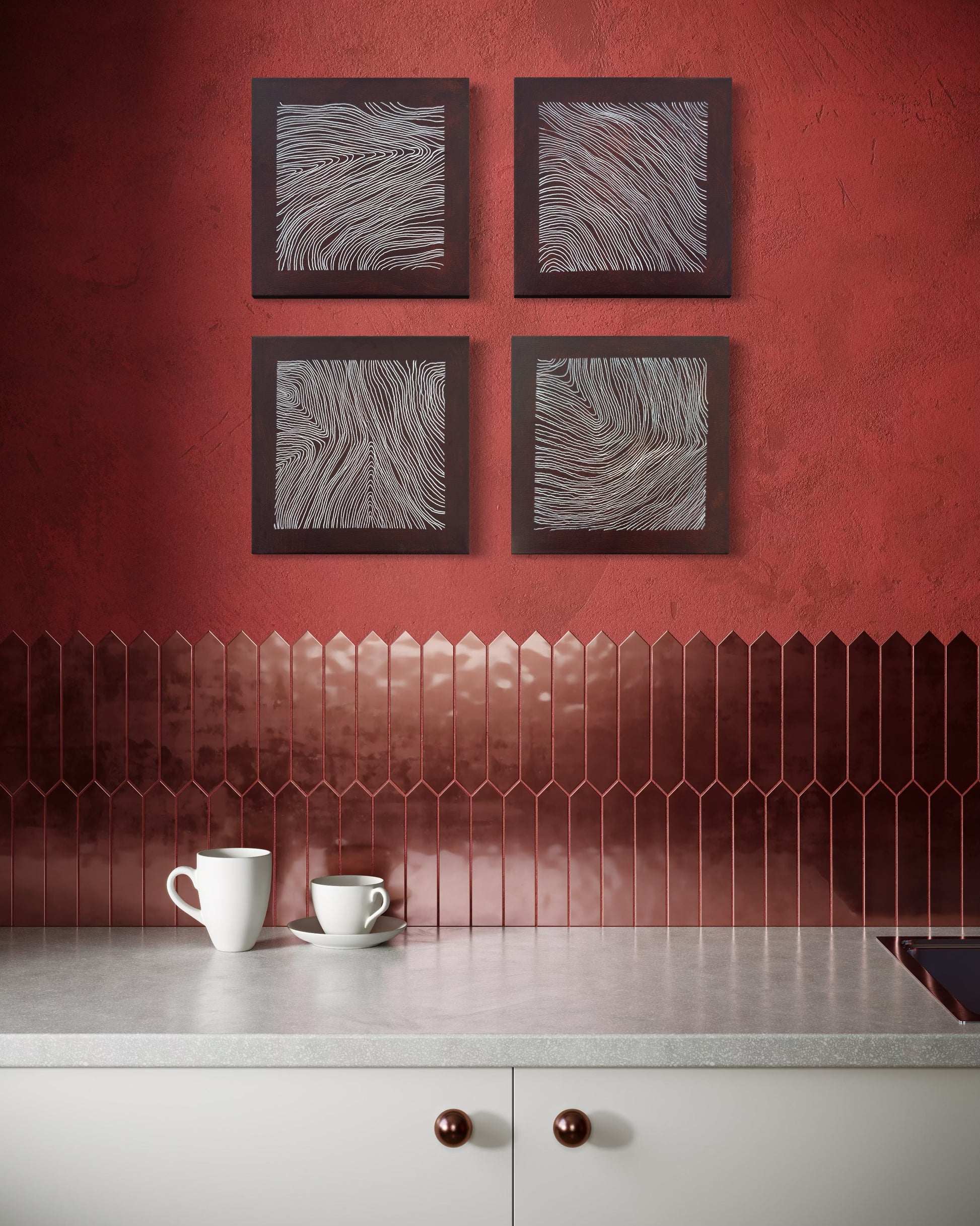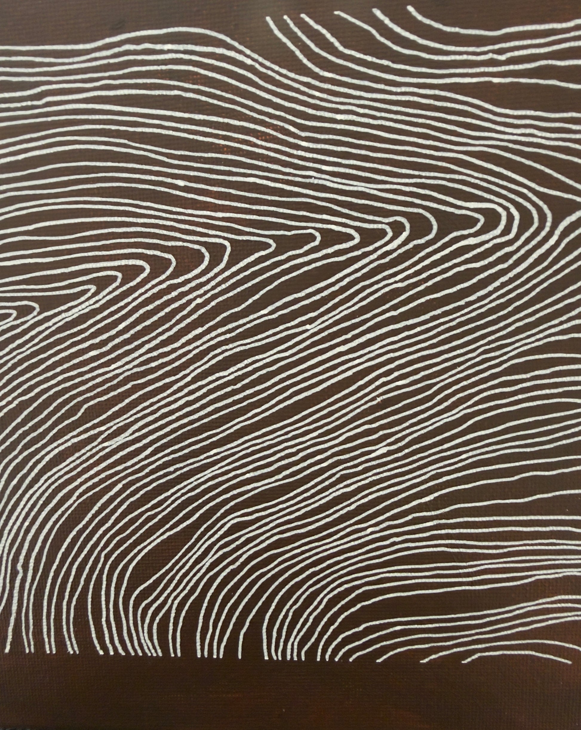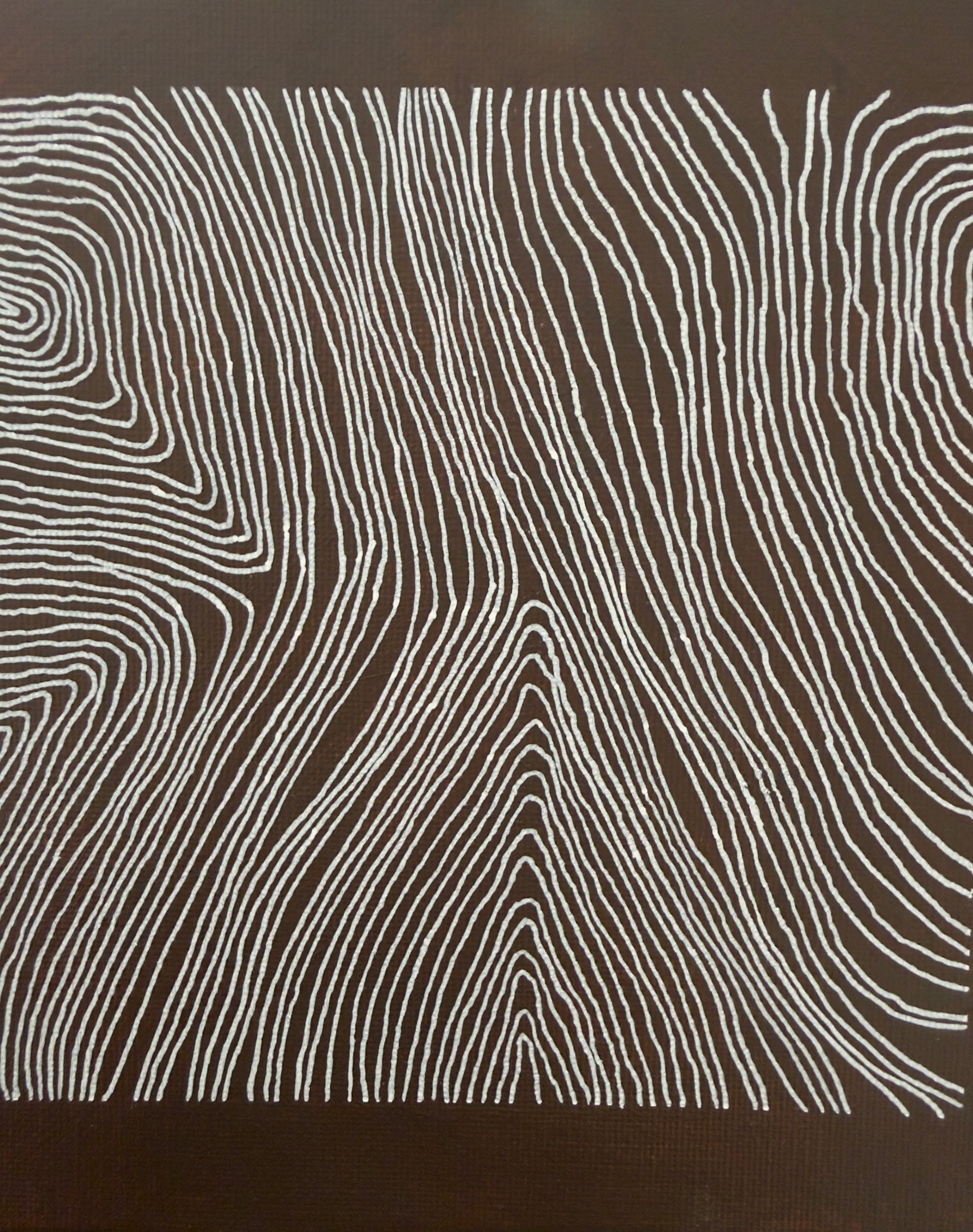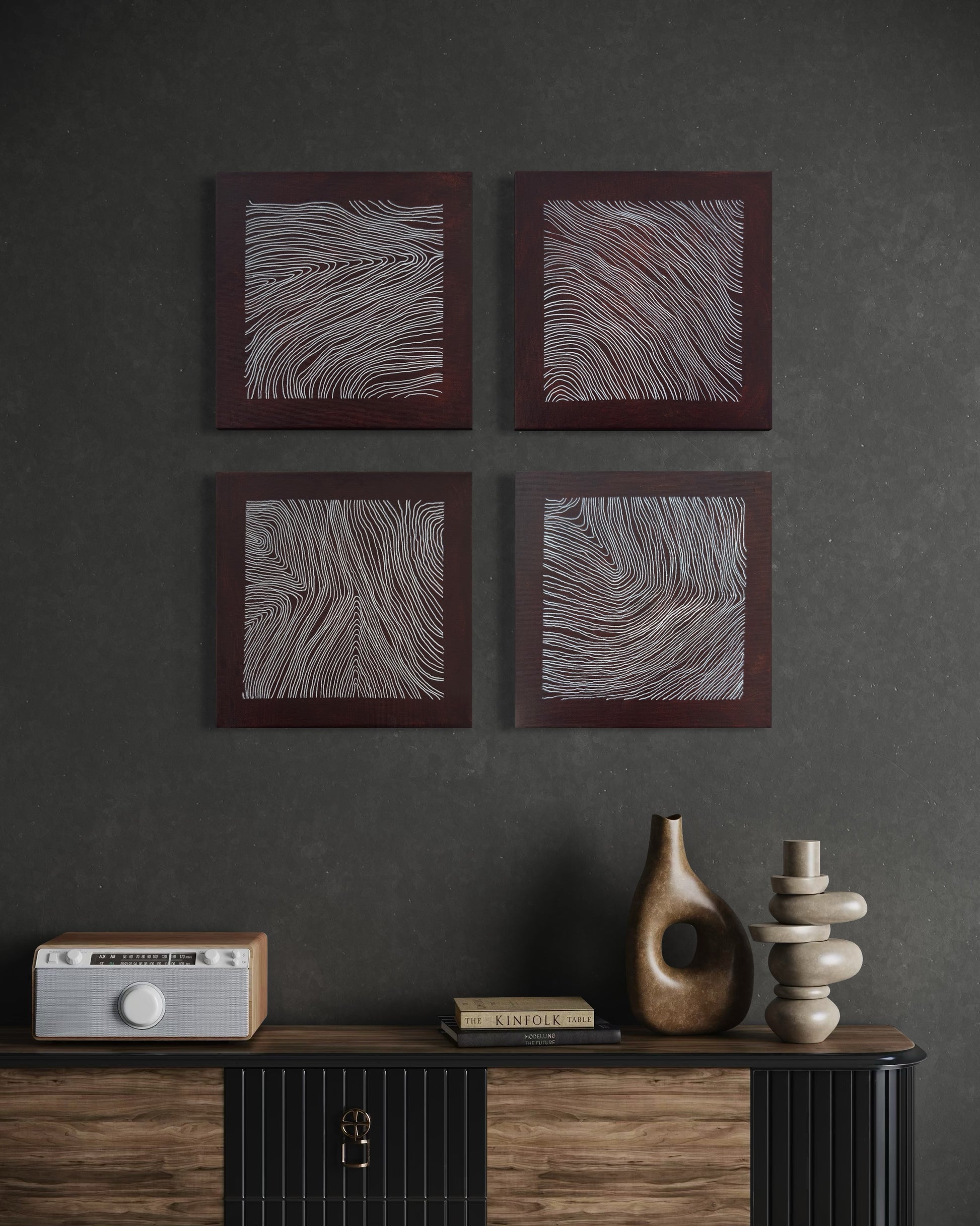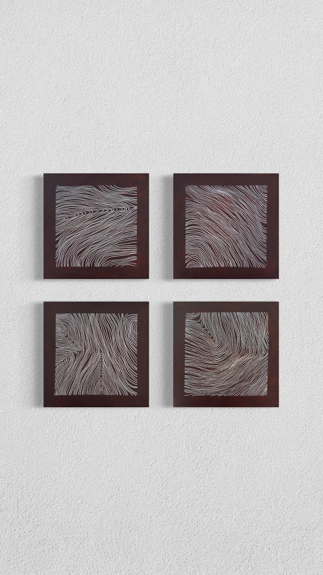The dark earth-toned grounds reinforce weight and containment. White lines accumulate as controlled traces, building tension within each bounded surface. Together, the works articulate plurality without dispersion.