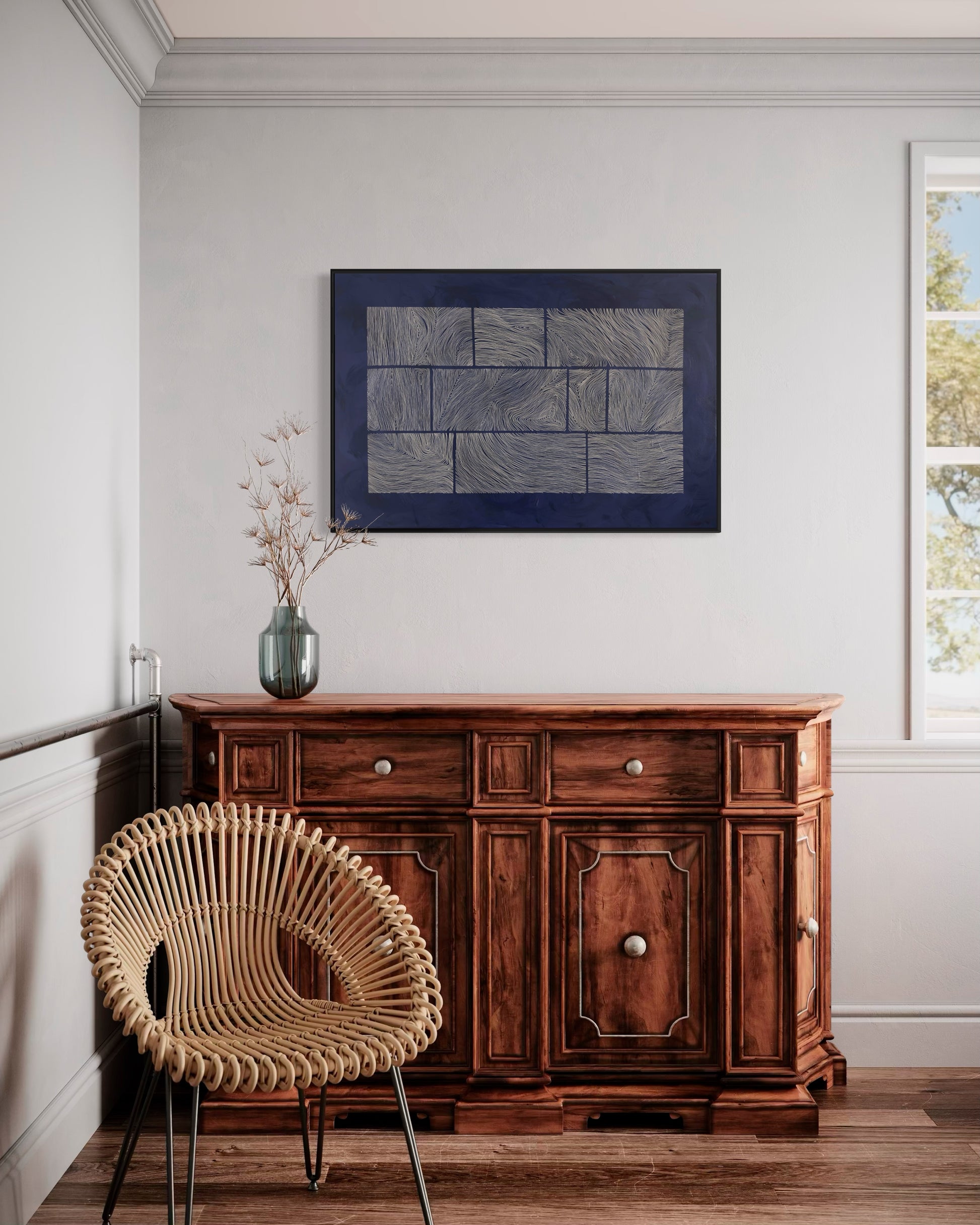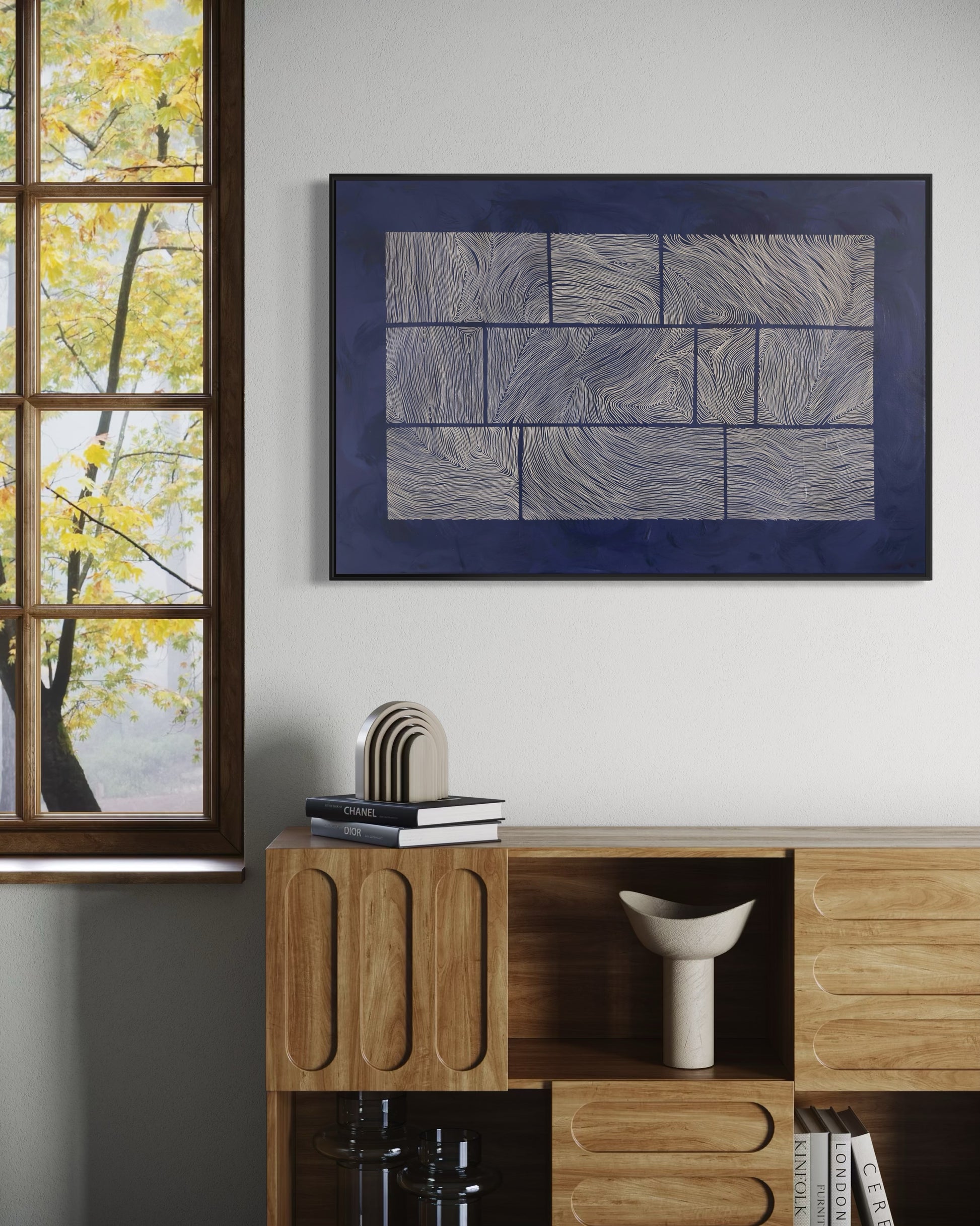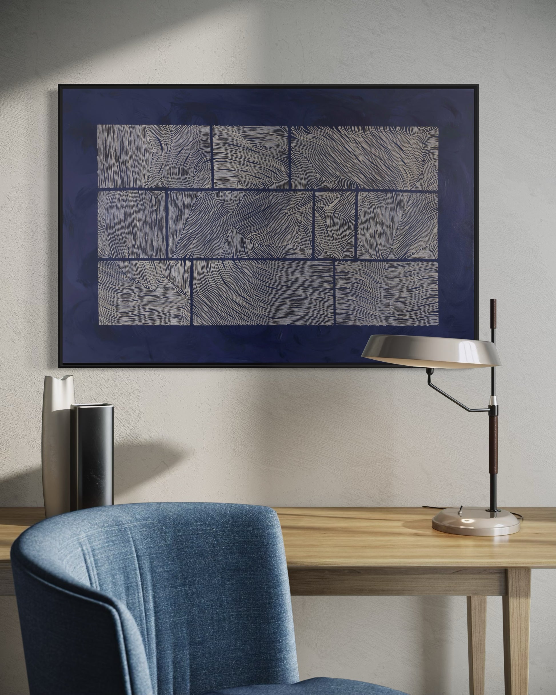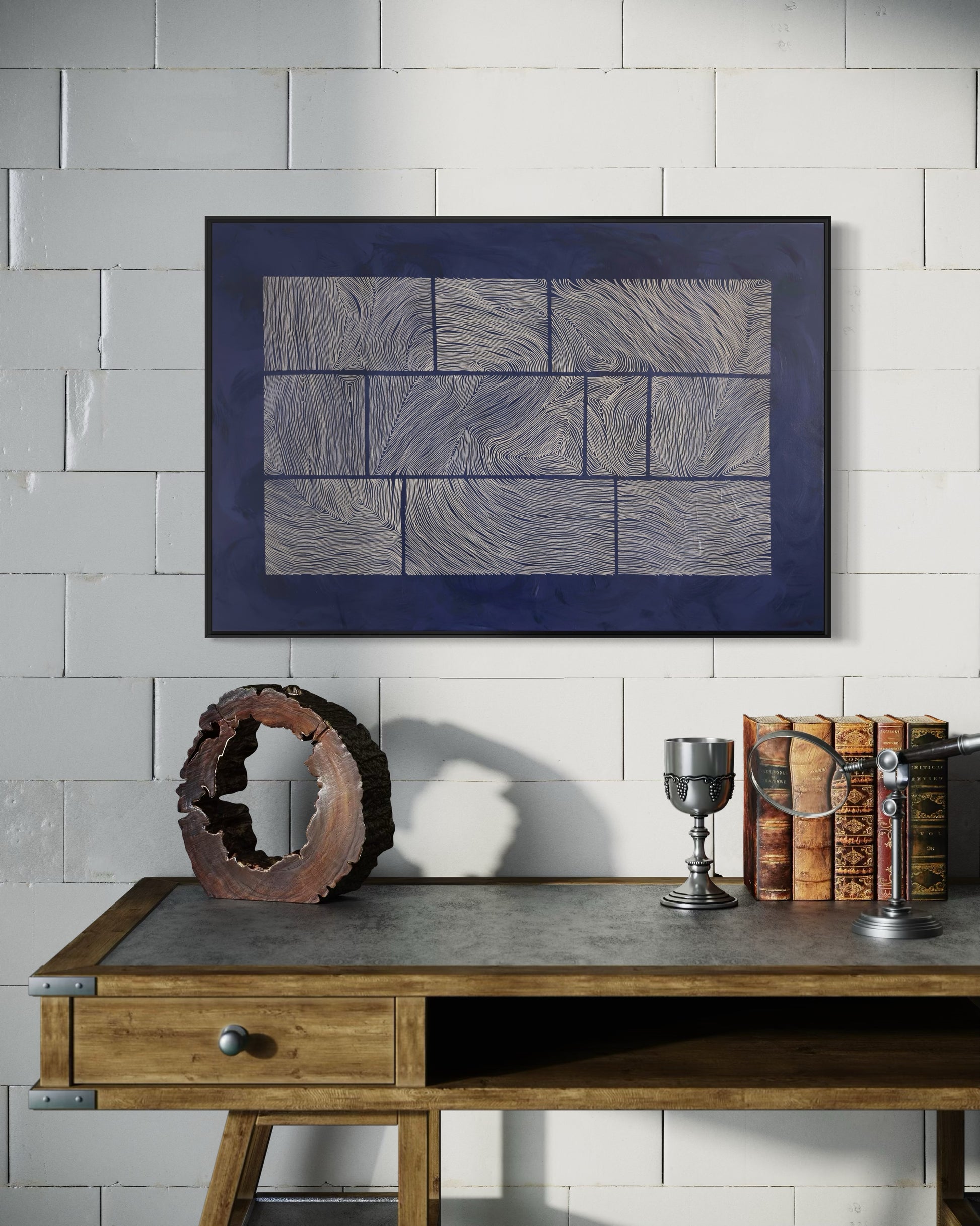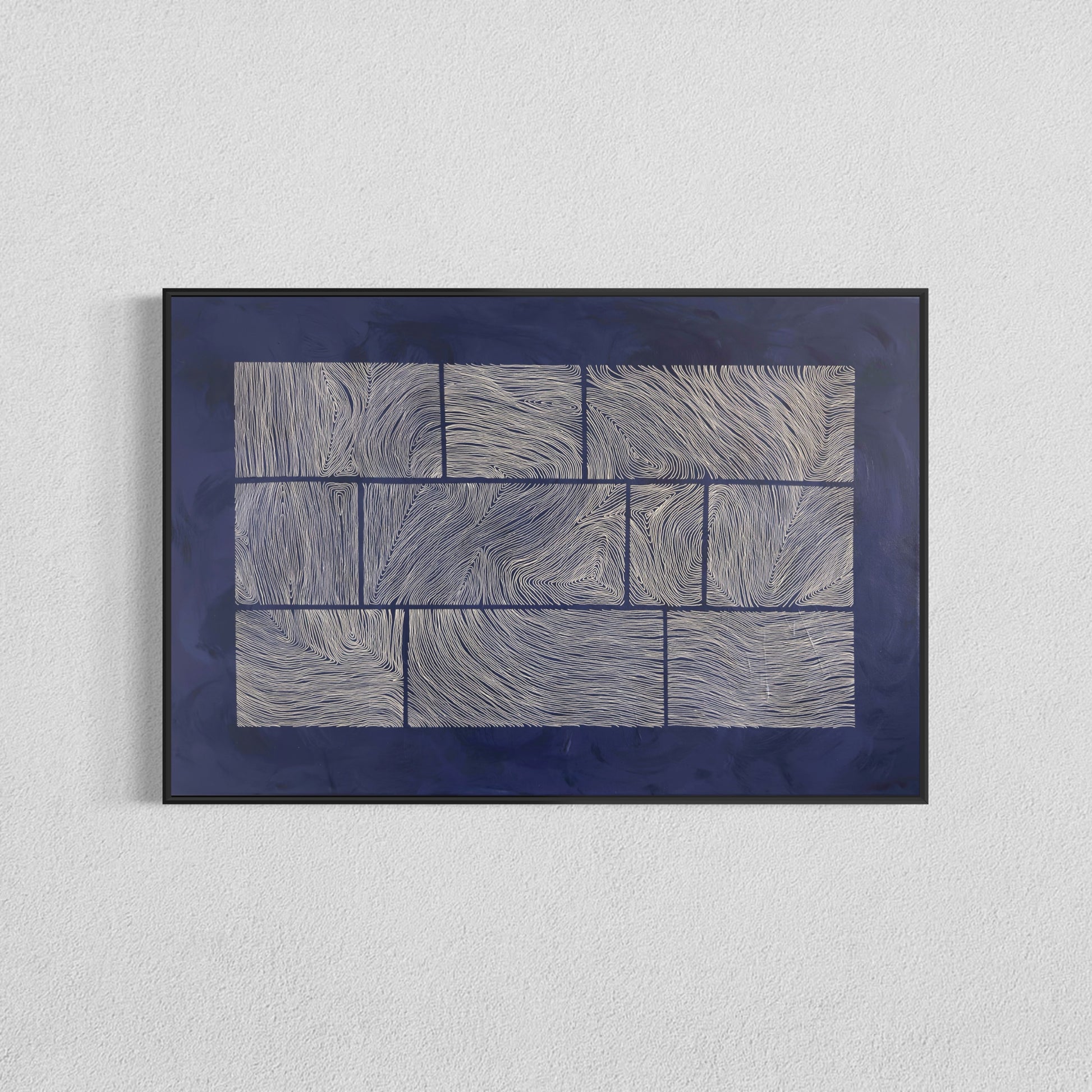 The deep blue ground establishes depth and restraint. White linear traces register as measured accumulations—contained, deliberate, and sustained. The work presents containment not as limitation, but as an active spatial condition.