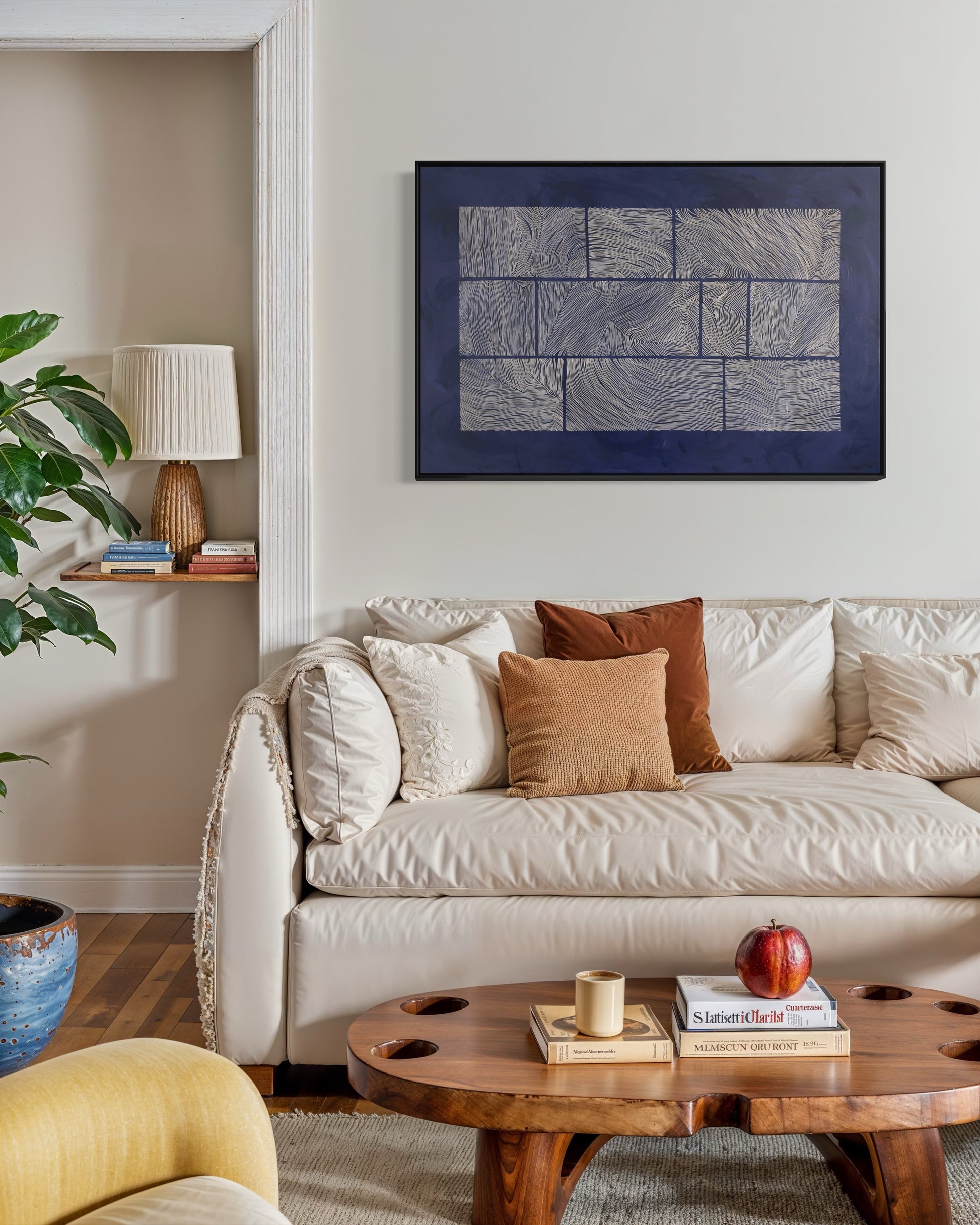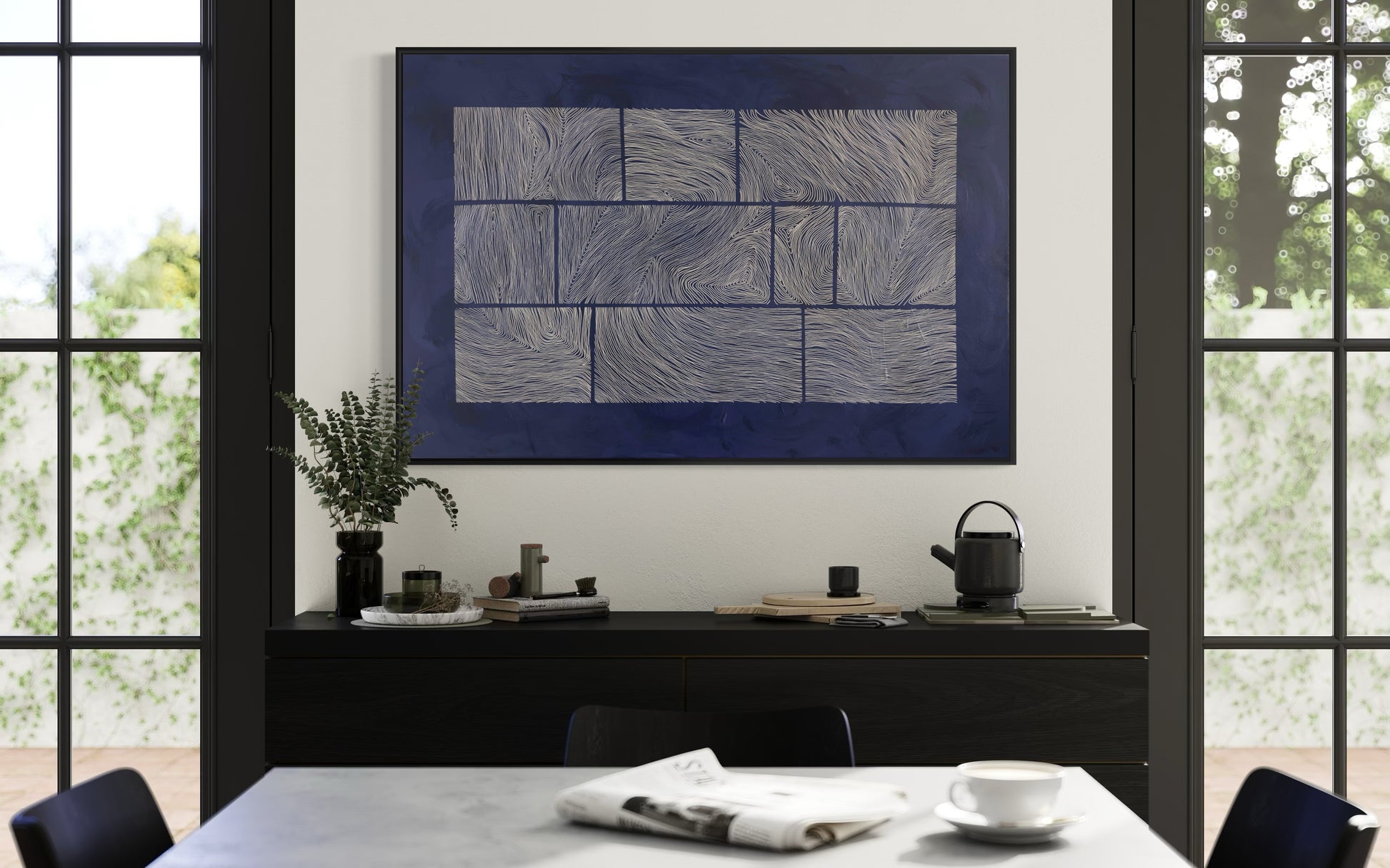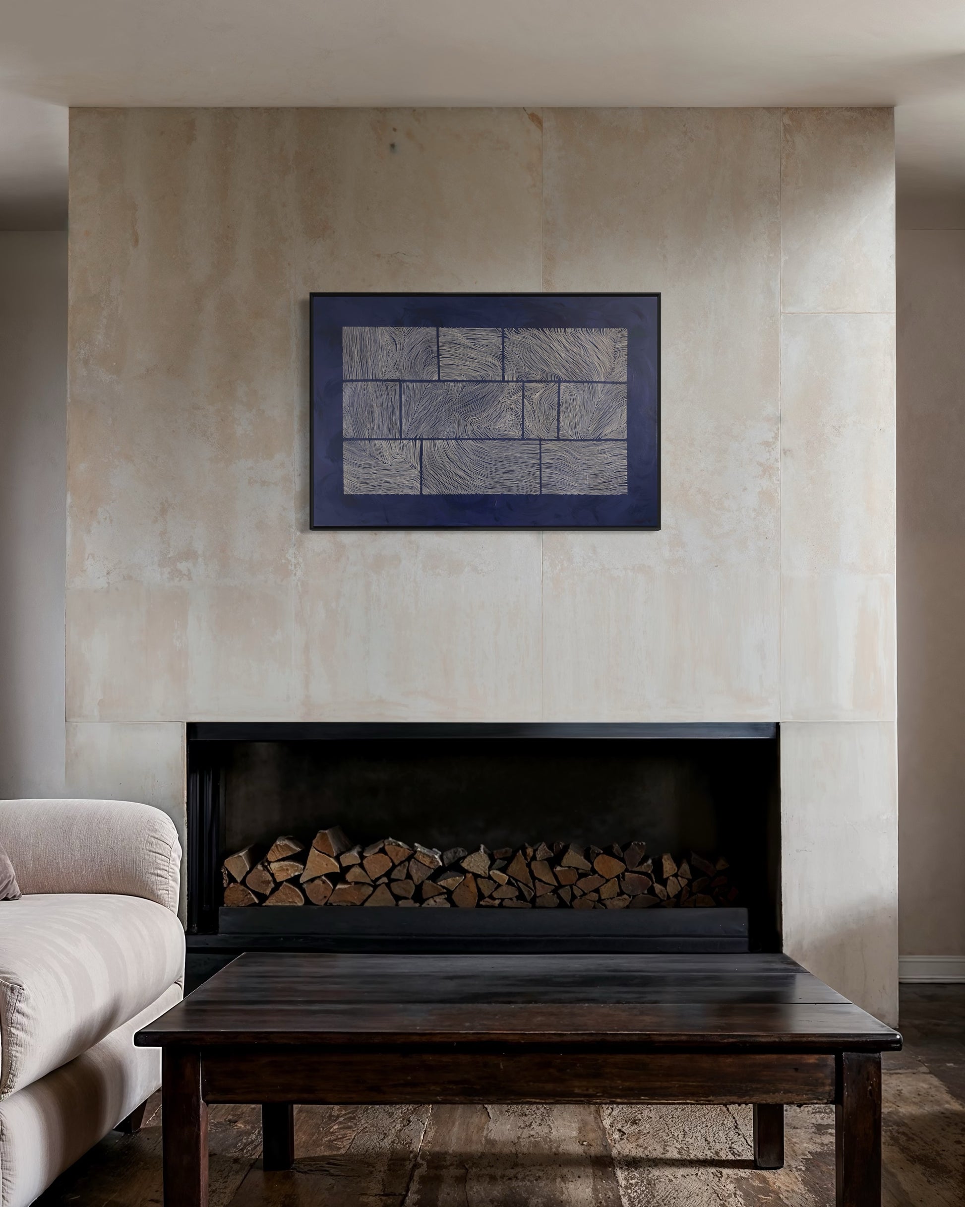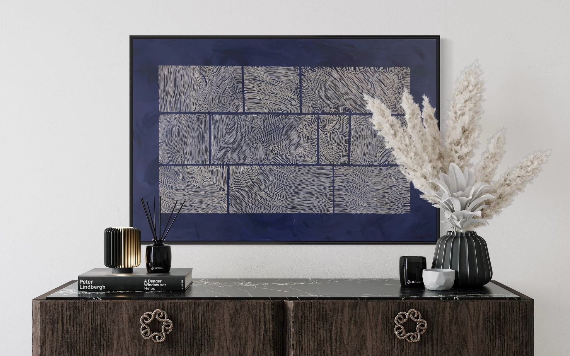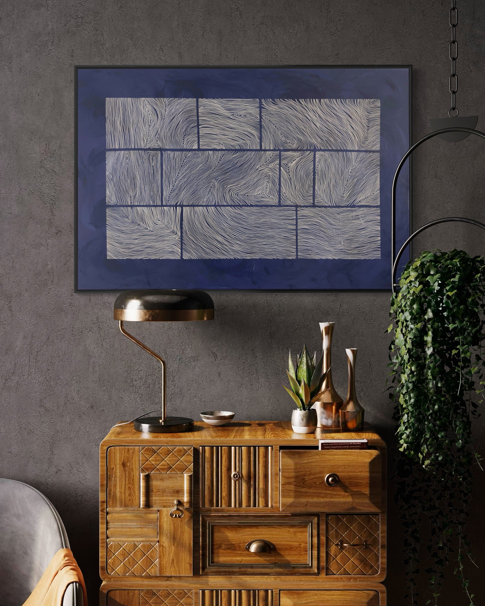 The deep blue ground establishes depth and restraint. White linear traces register as measured accumulations—contained, deliberate, and sustained. The work presents containment not as limitation, but as an active spatial condition.